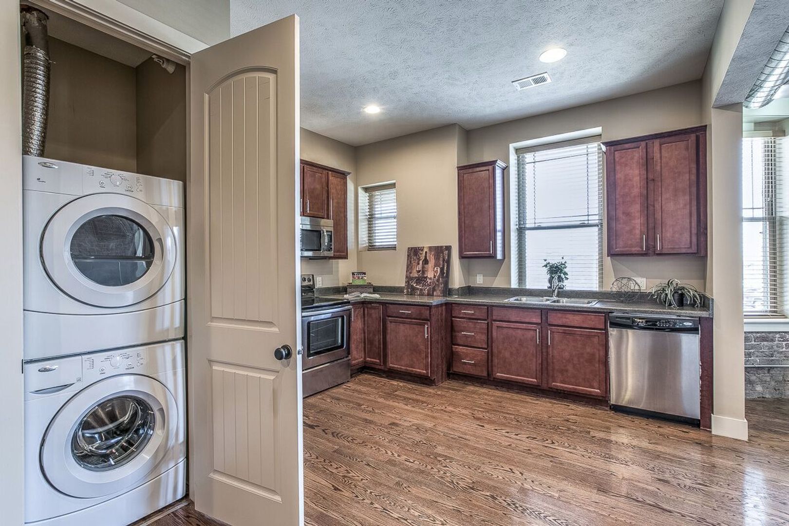 Gorgeous Flats with wood floors, 10 ft ceilings, exposed brick walls, huge windows, cherry wood cabinets, brand new stainless steel appliances, Washer & Dryer in apartment (no additional fee), amazing landscaping, central courtyard featuring large outdoor fireplace for entertainment & warmth. LOCATION: great interstate access, 10 minute walk to the entertainment district at Midtown Crossing, 5 minute drive to the Old Market, near UNMC and Creighton.