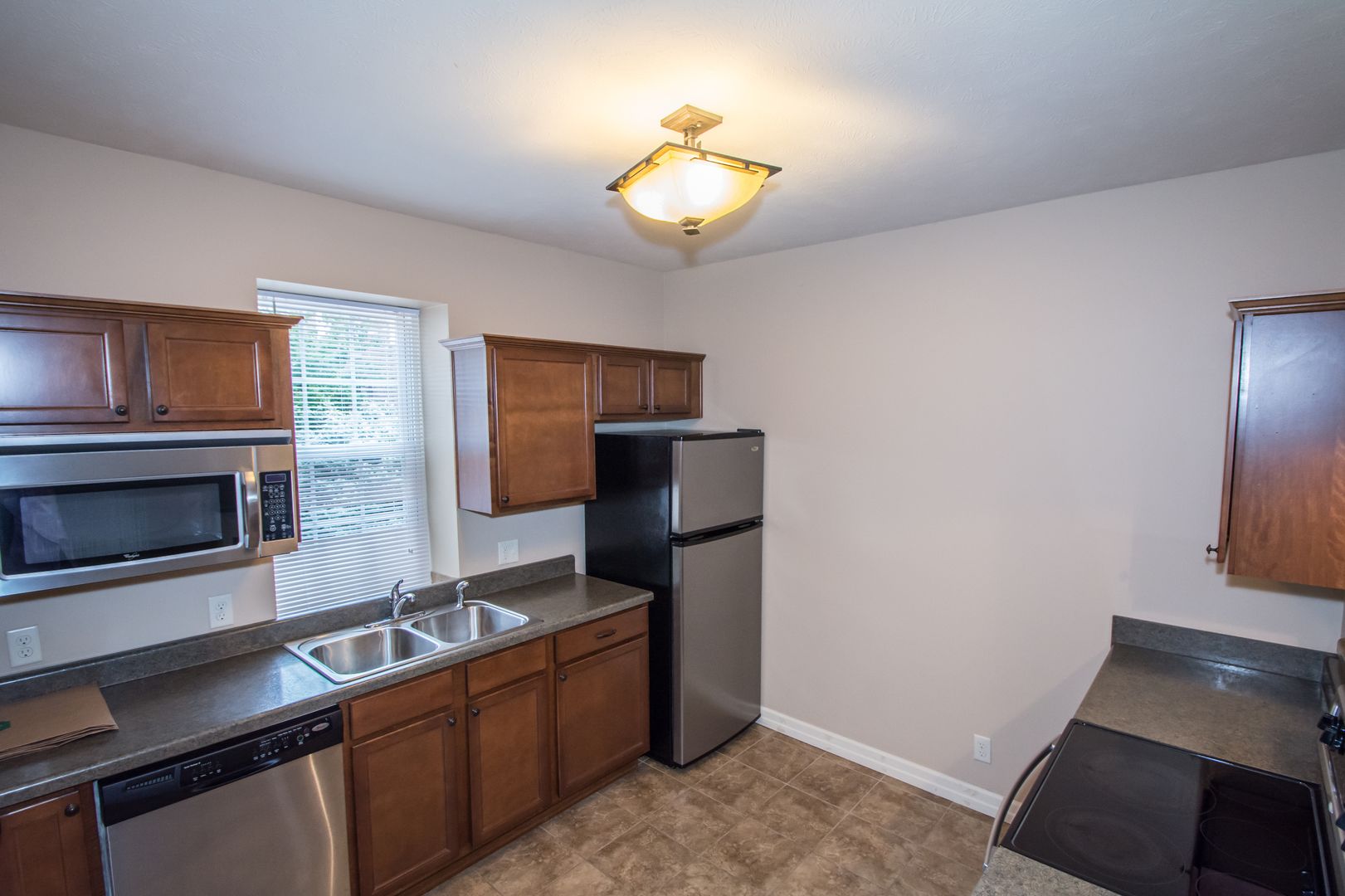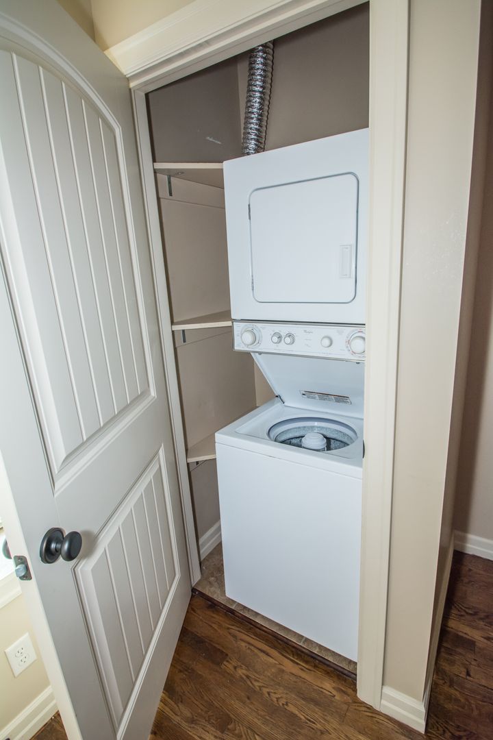 Stacked Washer/dryer (no additional fee), large windows (lots of natural light). The kitchen features brand new stainless steel appliances, dishwasher, self cleaning oven, garbage disposal, microwave, and a Fridge w / Icemaker, ceramic tile floors and dark wood cabinets, and a pull-up bar-height counter top located right off the dining space which makes the kitchen great for entertaining.